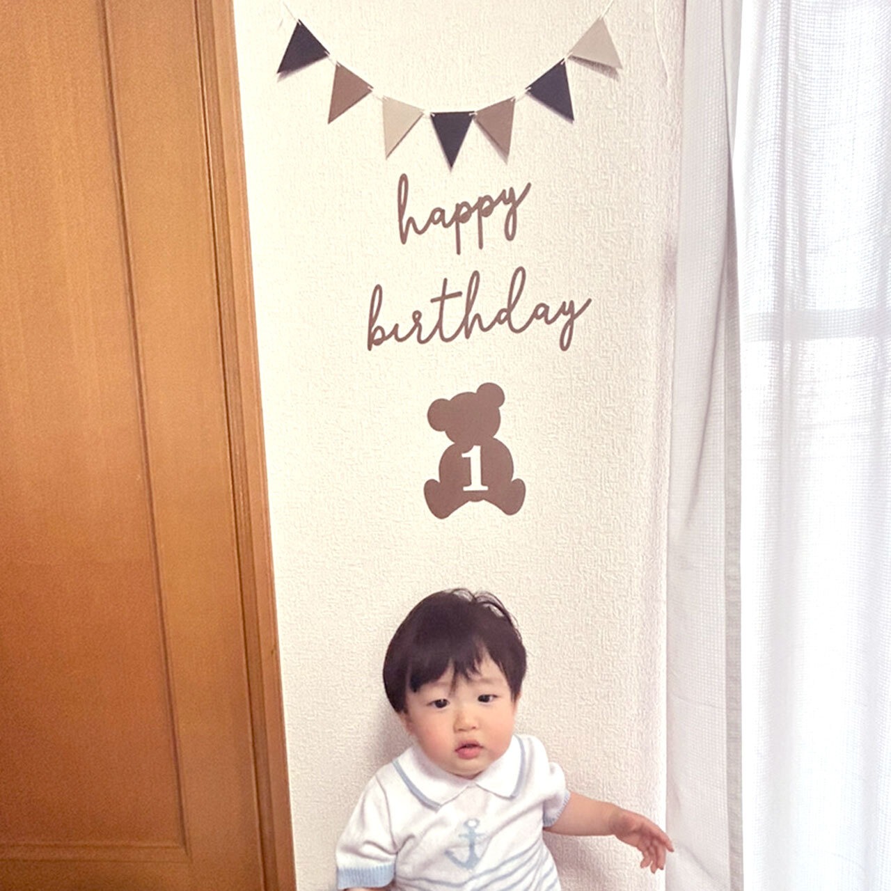 くまさんの顔のシルエットに数字の1が入ったバナーと、おしゃれな筆記体フォントのバースデーバナー(ブラウンカラー)、3色コーデのガーランドがセットになっています。